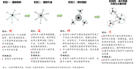 城市群发展的第三阶段为网状辐射阶段,这一阶段以“网”为主要特征,区域中心城市与周边其他城市形成了产业分工和功能互补,根据行政地位、经济实力、产业和交通辐射力逐渐形成区域次中心城市、功能性中心城市、功能增长型城市等城市等级;中心城市外扩的力量凸显,成为发展趋势。这一阶段的拿地机会主要在区域中心城市以外的次中心城市、功能中心城市和增长型城市。