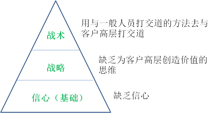 销售人员在战术上出现的问题是用与一般人员打交道的方法与客户高层打交道。