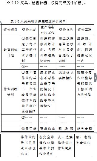 在图5-9组织实施完成度评价模式中,采用4M法+场地评价法进行评价。所谓场地完成度评价,就是生产场地实际布局设定与生产场地环境整理、整顿(5S)完成状况。所谓4M法即从人员(Man)、设备(Machine)、材料(Material)、方法(Method)的角度出发进行完成度评价。