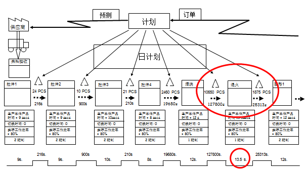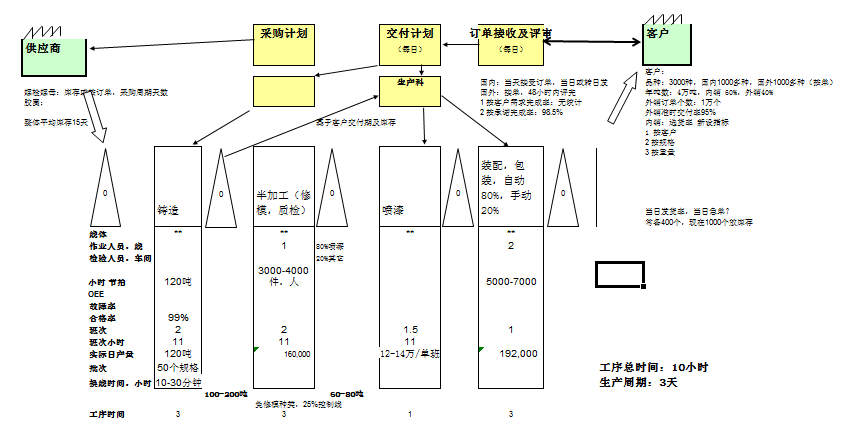 价值流分析包括宏观价值流和微观价值流分析,宏观价值流分析绘制企业层面的价值流图,分析影响交期的原因,包含当前预测模式、订单接收、主计划、车间计划、采购计划各个环节,这一步主要是分析各个环节的交付周期。如图1-3所示。