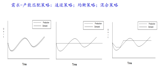 根据成品的寿命周期、需求稳定性、制造成本,合理确定需求-制造能力匹配策略。常见有三类制造策略:制造与需求匹配、制造能力均衡、混合制造策略。如图1-6所示。