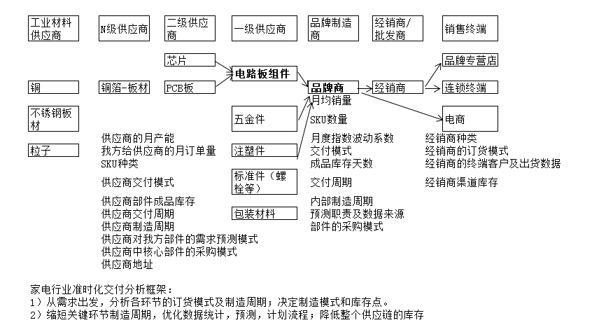 品牌制造商从总体上分析最终客户需求、渠道需求、自制能力、供应商及二级供应商的供货周期,找出影响交付的关键因素。图1-2是对家电行业的产业链分析,这一步主要是分析消费者、销售终端、经销商、品牌制造商、供应商的需求和计划模式。