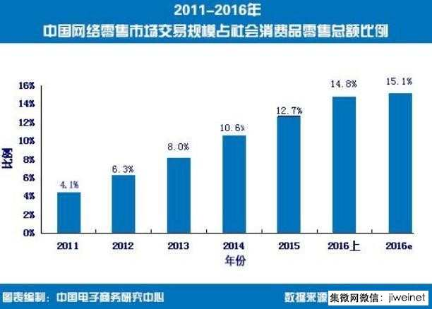 图7-20 2011-2016年中国网络市场交易规模占社会消费品零售总额比例