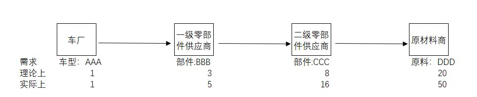 T车厂生产的中档轿车,车型AAA, 每生产一台这个型号需求部件BBB共3个,而生产BBB部件就需要生产部件CCC共8个,那么原料DDD每20个就可以生产8个CCC的部件。那么如果信息充分共享,车厂的1台车的市场需求实际上让原料商只需库存20个DDD就可以应付了。但是实际上,由于考虑到产品的合格率,配件返修,维修等,一级零部件供应商会加大BBB的库存到5,而二级供应商又会考虑到一级供应商的加急订单,又再增加库存供应量,而最后原料厂商会根据订单信息(比如生产16个CCC应该需要DDD共40个,因此收到订单信息是40),考虑其他风险诸如不良率,生产效率,提前期等因素,把供应设立在50。实际和理论的差异就在30,当然现实不可能每一台车或者每一个月的需求都固定在DDD是20个单位。