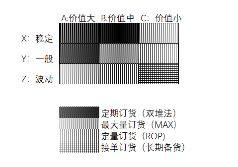 认识要建立库存的货物特性,是检查库存频率的依据。把过往历史数据中,进行ABC-XYZ结合,得出九种不同特征的分类,然后根据不同的特征采用不同的订货方法,再根据最近的销售表现,预测数据和订单数,分析库存建立的水准,从而确定订货(备货)量。比如AX类的,可以采用定期订货,甚至双堆法;BY类的,采用最大量订货,设立一个订货数量的上限,每次订货订到这个数量;BZ类的定量订货,确立订货点;CZ类可以考虑接到订单才订货。具体的订货方法并非固定,而是根据货物特征,再结合供应链中各种因素,采用适合的订货方法。