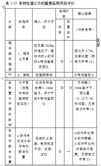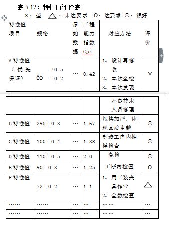 首先是特性值评价,即对能定量化的特性值,进行数据统计,评价工程能力,确定批量生产时的保证方法(表5-12)。