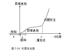 品质预测的关键是有没有“问题意识”,图5-14问题发生图。问题发生前,一般都会有一些异常现象显露出来,经验丰富或敏感的人,能很快地感知到,如图中b的位置。而对问题意识不敏感的人来说,往往等异常表现到问题已很难挽救时才能明白。这时,损失已经造成了(图中c的位置),而品质预测则是在图中a的位置,即无异常时就提前预知。