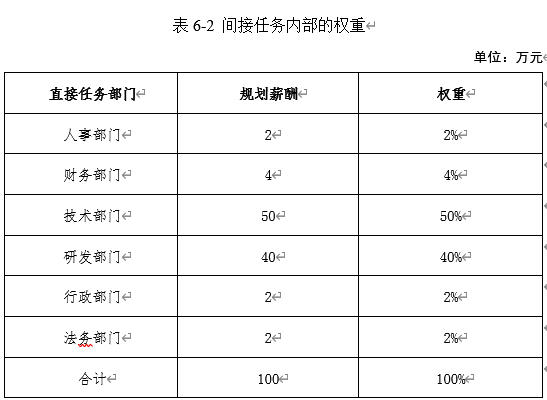 以间接任务部门为例,假设人事部门的规划薪酬为2万元,财务部门为4万元,技术部门为50万元,研发部门为40万元,行政部门为2万元,法务部门为2万元,总额为100万元。那么,这些部门在间接任务中的权重可以按照以下方式计算。如表6-2所示。