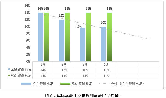 以图6-2为例,该图展示了实际薪酬占收入比率的趋势。从图中可以看出,这几个月来,实际薪酬占收入比率的趋势是下降的。这意味着在这几个月里,有预警事件发生但没有及时上报。为了有效管理预警事件,企业应设定员工预警事件的标准为实际薪酬占收入比率大于等于规划薪酬占收入比率。只有当实际薪酬占收入比率达到或超过规划薪酬占收入比率时,企业才能确保运营的稳定性和持续性。