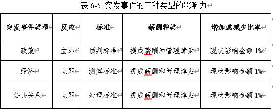 (3)公共关系突发事件:这类事件的处理需要管理者按照处理标准迅速作出反应,以维护企业的品牌形象和声誉。如果处理不当导致企业形象受损或经济损失,管理者也应根据表6-5中的规定,相应调整员工的薪酬。