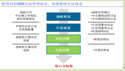 类似地,德邦对IBM年度计划预算体系也进行了消化吸收。IBM计划预算体系的核心目的是进行目标分解与确认,以及相应的资源配置;保持预算编制逻辑与管理逻辑(责任界定)一致;预算有足够的数据细度,能够支持执行过程的管控要求。