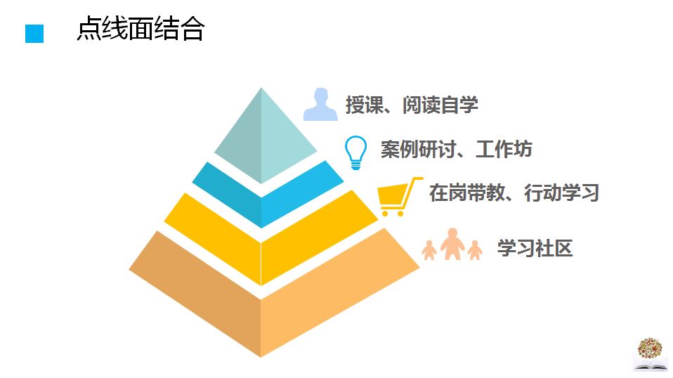 点的含义代表“授课”和“辅导”环节,面的含义代表“在岗练习”。通常而言,所有的培养模块都以点开始,以面贯穿。也就是说,我们会通过“授课”和“辅导”为基础,传授知识、技能和总结经验,然后通过“在岗练习”为实践,巩固和内化。这符合认知心理学的乘方法则。乘方法则强调学习过程不能间断,所以我在授课时有时会看到学员在方案设计中中断在岗学习的进程,这是有问题的,需要尽量避免。
