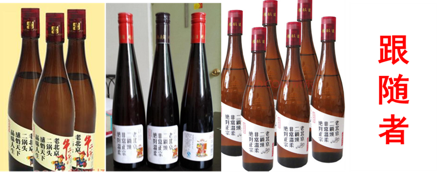 随着一担粮上市的成功,各种二锅头的跟随者开始模仿一担粮,深褐色的(酱油瓶)瓶子瞬间流行起来,“不走寻常路,让你做跟随者”真正印证了这句话。如图5-23所示。