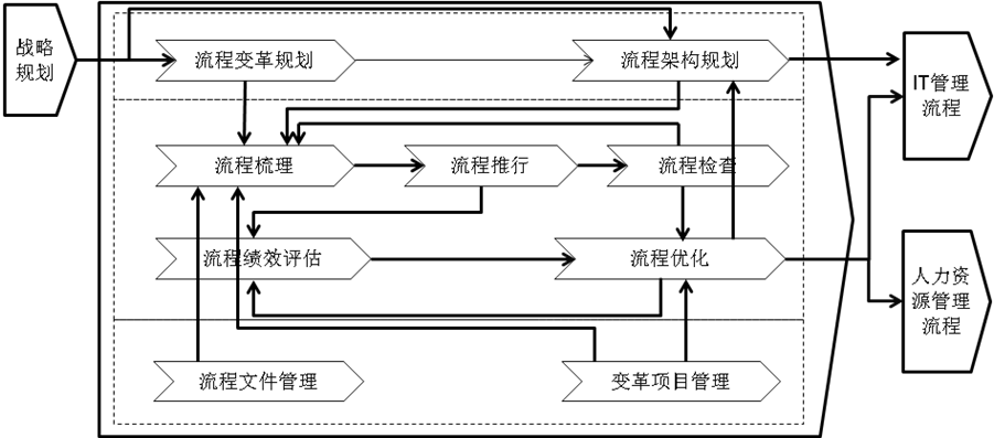 (2)从与其他流程间接口来看,首先,流程体系管理流程要与战略规划流程进行对接,即以公司战略规划结果作为输入,将战略目标与举措分解落实到流程体系变革项目中。这样做的好处有二:一是保证了流程管理体系的战略导向;二是战略导向反过来,强化了流程管理体系的重要性,有利于流程管理工作的推行。很多公司将流程变革项目写入部门的年度经营计划,并纳入该部门业绩考核中。其次,流程体系管理流程要与人力资源管理流程及IT管理流程进行密切配合,将流程优化方案作为人力资源管理流程及IT管理流程的输入,触发人力资源管理(组织职责设计、绩效考核设计、人员能力提升等)与IT管理流程进行同步调整与优化,达到流程、人力、IT的三线合一,保证流程管理体系设计的系统性与一致性,有利于发挥出管理的合力,强化流程优化的效果。