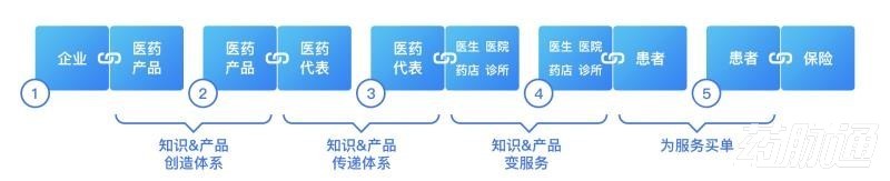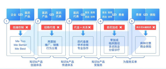 第二个价值链叫知识和产品传递体系。药企花了很多钱去创造知识、生产产品治疗疾病,但是药品背后的知识需要传递,在临床上使用——如何让每个临床一线的医生都能够将产品用到合适的患者身上,能够在合适的阶段把治疗发挥到最大的效力,这必须由药企原原本本把他们创造的知识在不失真的情况下传递到临床一线。