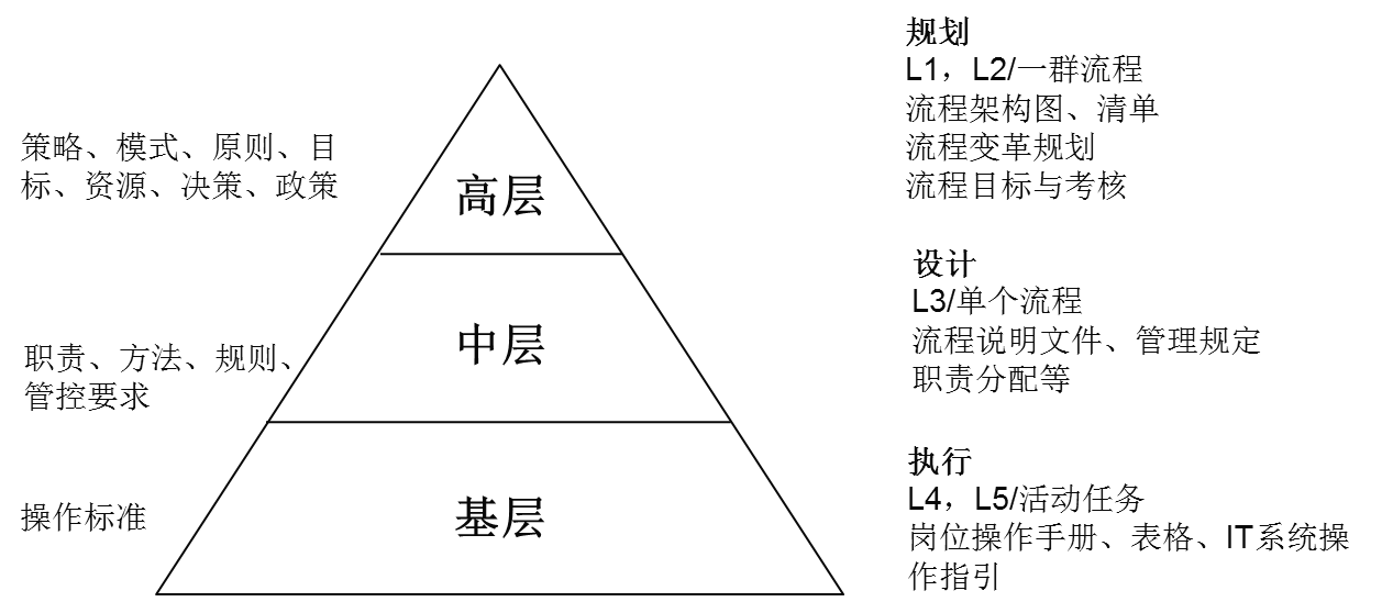 可见企业推行流程管理效果不佳的重要原因之一就是中高层管理者缺乏管理工具,他们不关心深入细节的流程文件、操作指导书、模板表格等。他们需要流程管理提供与他们管理层级相匹配的管理工具,这就是我们常说的分层管理。
