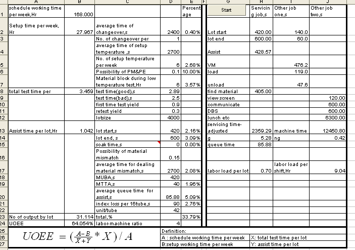 设备利用率模型:这里假定设备利用率损失包括2部分,与批次相关的部分和与批次无关的部分,利用宽放抽样,秒表计时和Wright公式3个方法来计算各种损失。在表格中,A代表每周总时间,B 代表与批次无关的损失时间,X代表做一批的标准时间,Y代表每做一批的时间损失,(A-B)/(X+Y)则计算出了每周所做产品的批次,批次×X/A就得到了设备利用率。通过这种方式,可以分析当改变lotsize,人机比和MUBA等参数时对设备利用率的影响。