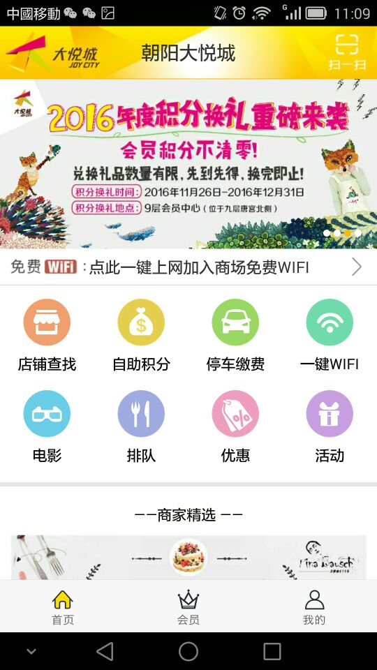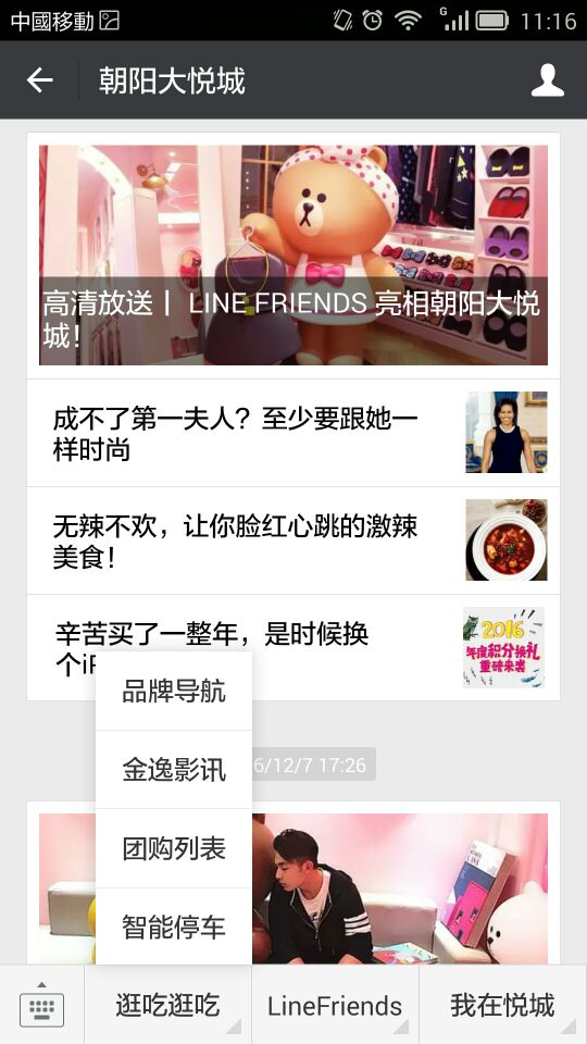 我们以朝阳大悦城的APP为例。朝阳大悦城APP的基础功能包括:楼层商户的索引、商户优惠信息、商场PR活动、会员积分兑换、餐饮排队及送餐、电影院排片及订票、停车缴费、一键WIFI等八大主要功能。在其微信公众号上,也同样具有品牌导航、影片资讯、团购列表、智能停车、会员服务等一应功能。而且,APP与微信公众号之间的数据是互导互通的。