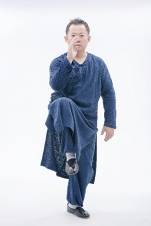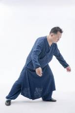 2.左实脚不动,左脚心继续往下踩,右后脚重心缓缓前移,直接以脚心之回劲带动后虚脚之膝,浮起提至中盘,向上荡起至大腿与胯平,右手肘置于右脚膝盖上方,脚尖自然下垂,左手中指微微翘起,尾闾中正。如果动作1跟动作2无法连贯一次完成,那可以先把右后脚缓缓向前移至左脚尖旁,脚尖点地,再行提脚,作为过渡。此定式为左金鸡独立。