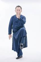 4.右脚不动,以脚心之回劲带动左虚脚之膝浮起,左手肘置于左脚膝盖上,向上荡起,同时右手沉落于右腿旁中指微微翘起,左膝至大腿与胯平。此定式为右金鸡独立。