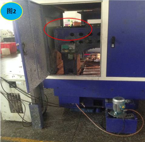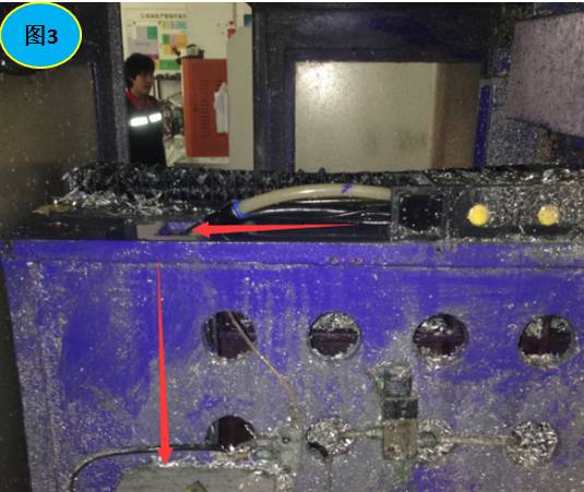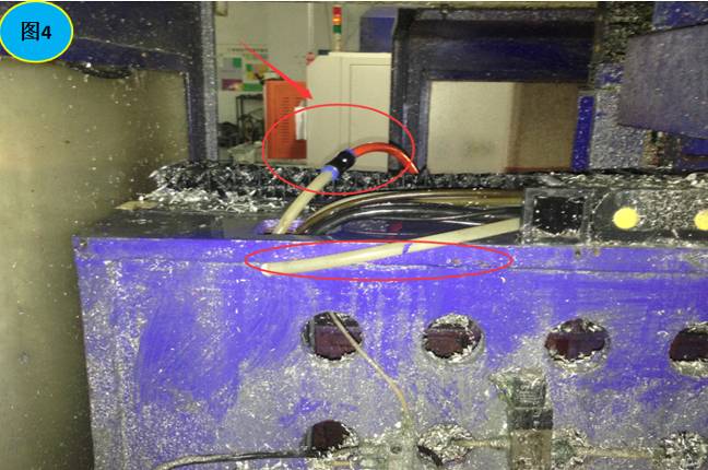 见上图,机加车间主管把切削液的管子改了一个走向,直接链接雕洗机的钻头处。