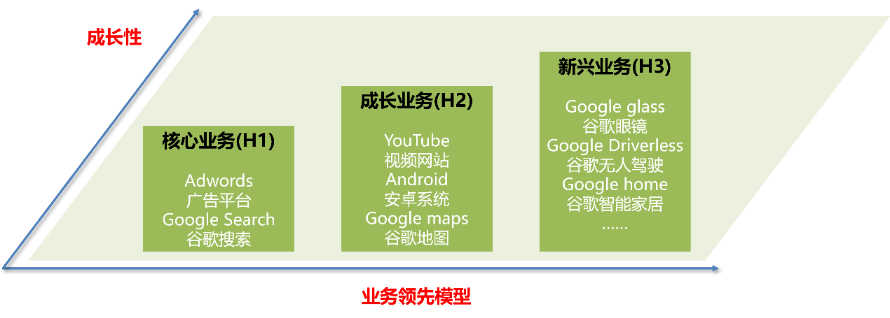 谷歌第二层业务称为成长业务(H2),指未来一段时间后(通常3~10年内)将迎来行业的高速发展期,很快可以像第一层业务那样为企业贡献营业收入和利润。