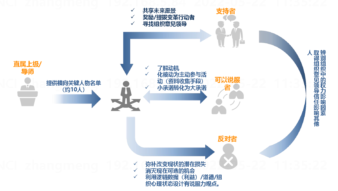 横向关键人物分为三类:支持者、可以说服者以及反对者。对于三者要有差异管理策略。对于支持者,选择共享未来愿景、奖励或提拔变革行动者和寻找组织意见领导。可以说服者是存在不确定性的,因此还是主要从了解动机、化被动为主动参与活动、小承诺转化为大承诺策略开展。在实际的操作中,人的趋利避害倾向,极其容易让新任干部忽略了反对者的横向影响,在全力冲刺的关键环节功亏一篑。反对者不仅仅指因个人情感估计持相反意见的对象,更需要关注持中立态度,以组织利益为主要判断标准的部分对象。面对反对者,要有策略弥补改变现状的潜在损失、消灭现状可选的机会、利用逻辑数据(利益)或道德或组织心理状态设计有说服力观点。总之而言,纵然不能改变反对者,也需要让反对者不做偏激反对行为。如图7-7所示。