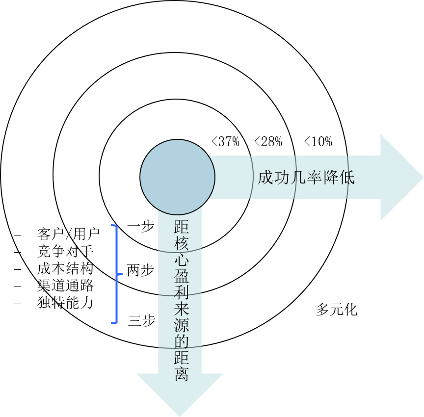 这一期间,普拉哈拉德和哈默尔提出了极具影响力的“核心竞争力”概念,普拉哈拉德和哈默尔认为核心竞争力是为公司经营的各项业务提供“主线”的能力或者技能。核心竞争力理论虽然影响很大,但遗憾的是相应的工具却没有提出来。后来贝恩公司(2004年)受到该理论的启发,发现核心业务与潜在扩张机会之间存在“盈利来源距离”,提出了一个工具如图8所示。