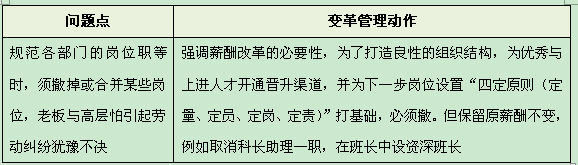:其实在推进薪酬改革的过程中,我们也碰到一些问题。比如,在调整组织架构后,规范各部门的岗位职等时,因为历史原因或因人设岗等,须撤掉或合并某些岗位,个别部门经理便绕开项目组直接与公司老板沟通,说“这些岗位不能撤!”或“这些员工已经工作了许多年,一旦撤掉,会引起劳动纠纷”等,而老板也找项目组沟通,犹豫不决。