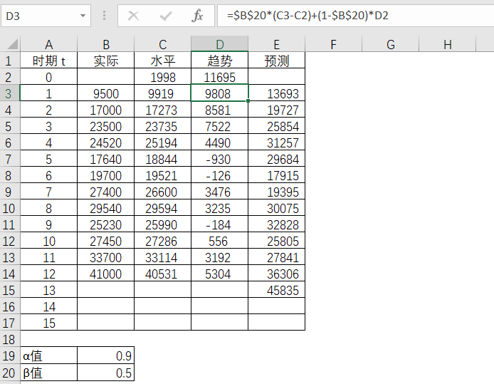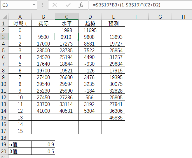 有了初始的水平值和趋势值之后,确立相关的参数α和β的值,就可以代入公式去计算。其中α值为0.9,β值为0.5,就可以得出如下: