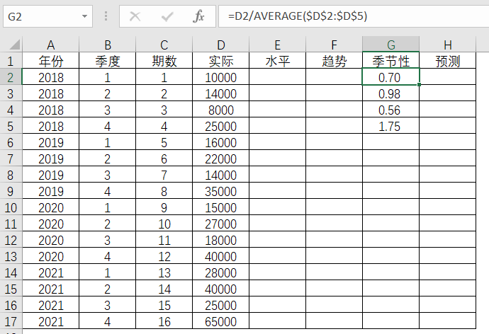 如此类推,得出2018年第1季度到第4季度的各季度季节性因子。由于2018年的全年数据作为观测值,那么水平值和趋势值初始值就是2018年的第4季度了。趋势值初始值为1875,而水平值可以根据当期的实际值,剔除季节性因素而得出,所以初始水平值就是当期实际值除以当期的季节性因子。2018年第4季度的季节性因子在之前计算得出为1.75,那么2018年第4季度的水平值就是