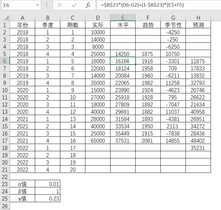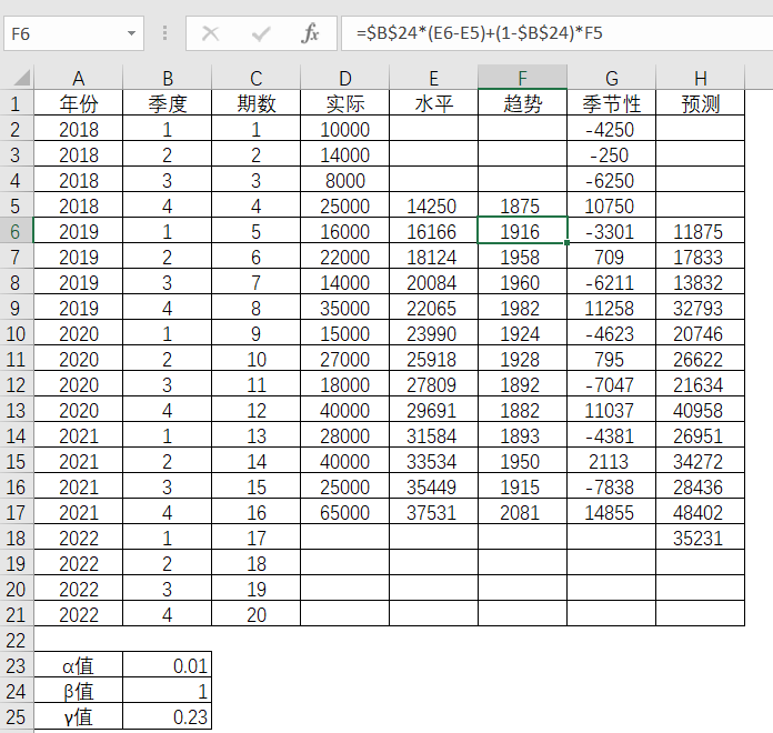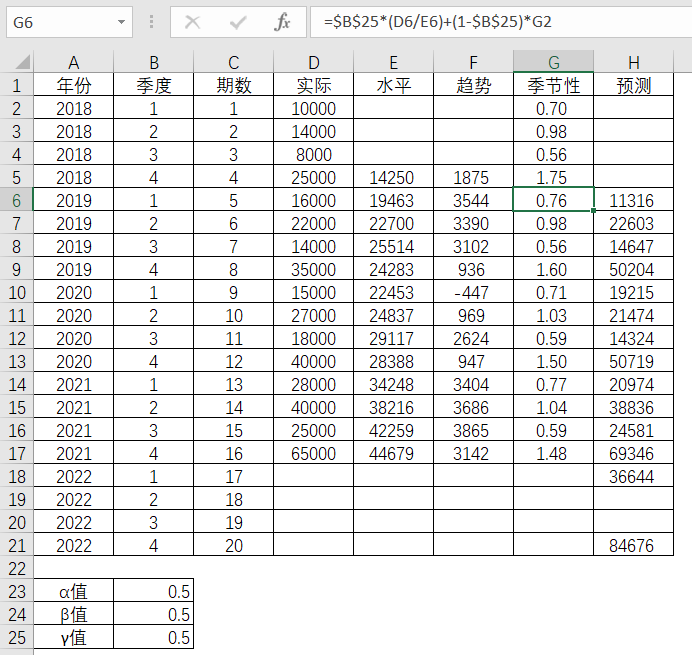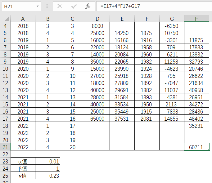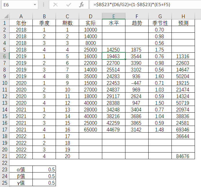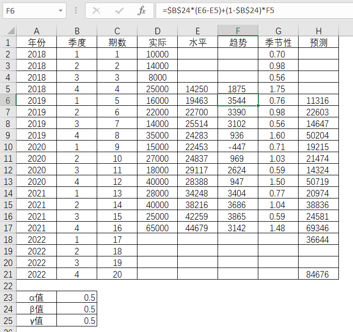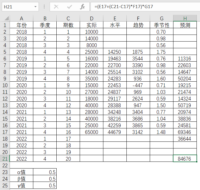 在知道16期的水平值,趋势值,季节性因子的情况下,也可以通过公式求得第20期(即2022年第4季度)的预测值。