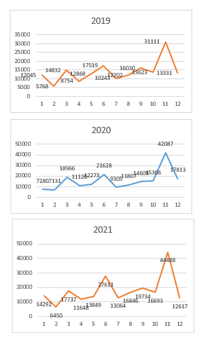 某电商近三年的销售数据,尽管三年的实际每年总需求,月均需求都各有不同,不过通过三年的比较可以看出,基本发展特点都比较相似,而且均含有上升趋势和季节性的特点。