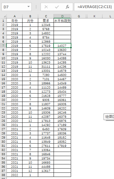 因此第一步,可以消除季节性和噪声的特征。移动平均是一个有效的方法,移动平均能把起伏的波动拉成相对平稳的状况,从而某种程度上,去到“削峰填谷”的作用,减少季节性带来的波动。根据观察,每12个月都会出现雷同的波动情况,那么以12个月为一个周期进行计算水平估计值。