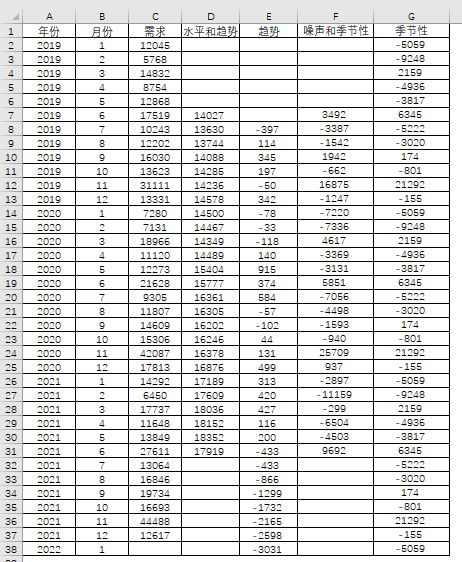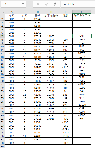 同理,需求减去已经得知的水平和趋势后,就是噪声和季节性。