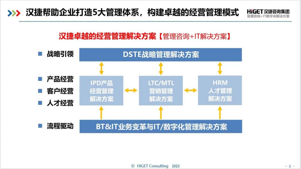 汉捷咨询——IPD咨询的开创者与引领者,落地式DSTE解决方案开创者,落地式LTC咨询开创者,21年来40+专业顾问的咨询及培训实践,为350+客户提供了700+成功咨询项目,12000+客户提供了培训服务。汉捷始终以【帮助企业实现卓越,成就伟大】为使命,【成为管理咨询与数字化解决方案的国际先锋机构】为愿景,帮助企业打造卓越的经营管理体系,助力企业做好5件事: