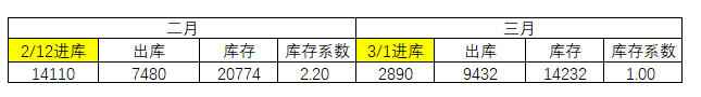 比如二月份是春节假期,按照正常来说,二月一日或者二月第一周就可以补货成功,不过春节海关放假,物流压力增大等各种因素,导致估计二月二十二日才可以补货,所以按照要求至少要在1以上的系数来确保库存充足和安全,不过春节因素和物料是进口因素,清关周期的不稳定和国家运输的波动性,从而把库存系数定在2.2这个基于主观判断的数值上,最后反推出要订货数量是14110,同理三月订货,因为只需要考虑进口清关因素,把库存系数设立为1.00这个主观认定上,计算出三月采购量是2890个单位。