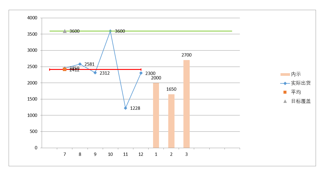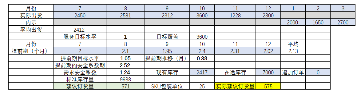 其次为了弥补预测不准确而带来的风险,因此把服务目标水平定义在1(即100%),对此目标的覆盖量就是3600,也就是意味着按照过去6个月的最高的发货数值的100%来取值。同时,过去6个月的平均值为2412,这意味着这个最高值比平均值高出约50%的水平。但是提前期并不是1个月,并且考虑到覆盖风险,已经确立了提前期的安全系数期为2.52个月,因此在2.52个月提前期内,要想达到3600的目标出货水平,需要在平均出货2412的基础上提高1.24(124%)的水平。