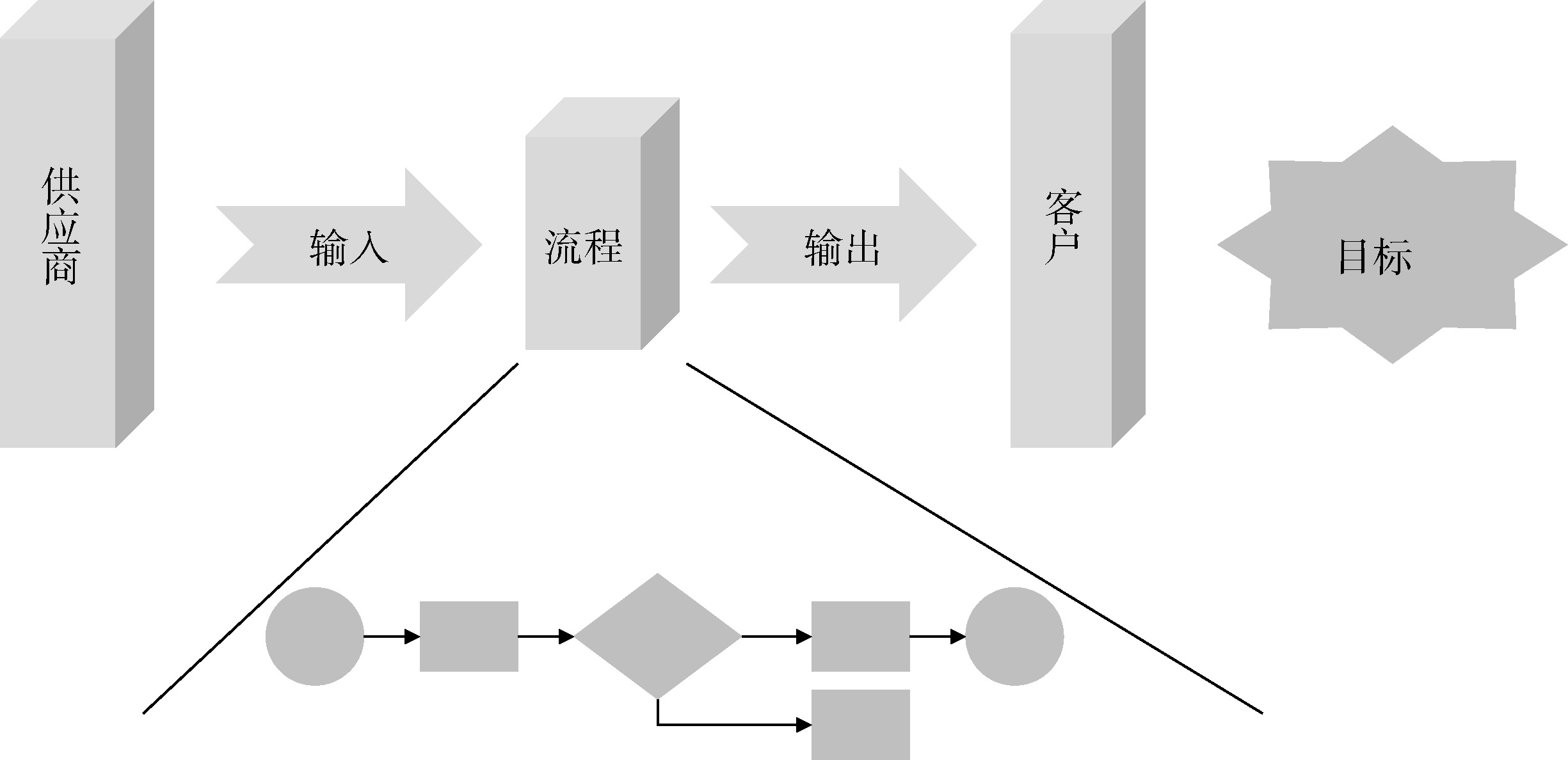 (5) 客户(Customer):接受输入的人、组织或流程。这里不仅指外部客户,还包括内部客户,例如,材料供应流程的内部客户就是生产部门,生产部门的内部客户就是销售部门。
