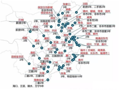 在“天龙八限”中,限购和限售是使用范围最广、也最有效的调控手段,以下是全国的限购和限售城市分布情况。