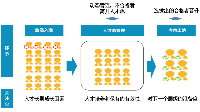 根据企业的实际情况,跟踪考察的内容可能是绩效、敬业度、能力素质达标率等,但不论是选择什么考察内容,其优先目标是通过及时的劣汰,保持人才池的质量,尤其是关键岗位的梯队,宁缺毋滥。
