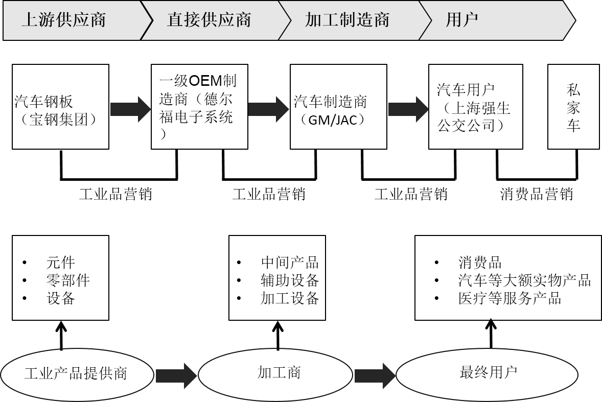 以汽车为例,我们可以把工业品营销和消费品营销做个比较。汽车的生产过程中一般会有两三个工业品营销环节:上游供应商将钢板等原料卖给汽车配件OEM制造厂,这是典型的工业品营销;OEM制造厂把配件卖给汽车组装厂,这也是一个工业品营销环节。汽车生产后被卖给直接消费者(私家车主),这就是消费品营销;汽车被卖给企业或是公交、出租公司,这就又是工业品营销了。如图2-2所示。