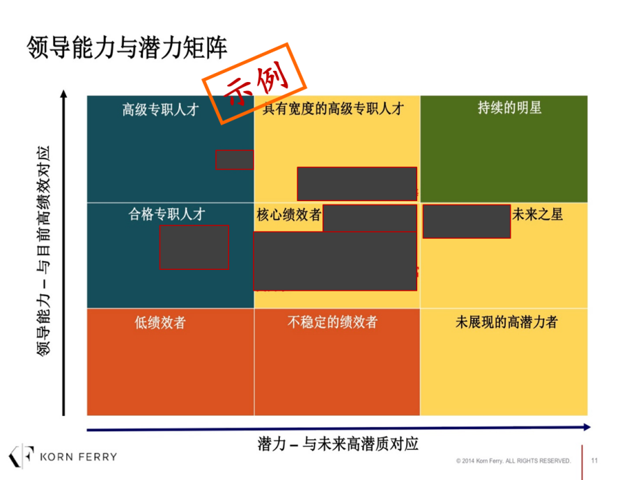 最后一种九宫格评价:胜任力-潜力,如图10-5领导能力与潜力矩阵所示(图片经过处理,遮盖了被盘点人员的真实姓名)。