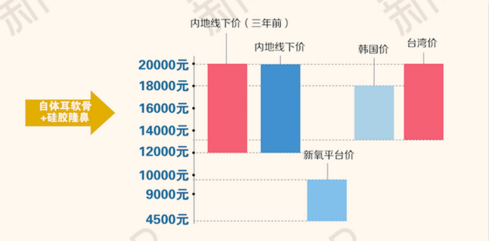 与注射项目的一路走低不同,尽管新氧上的手术项目价格是线下机构的一半,甚至更低,但线下机构的手术价格却并没有随之回落。