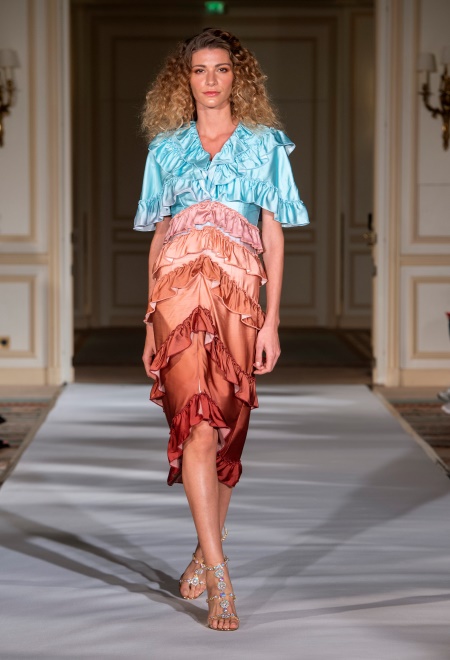 膨胀与收缩性:利用色彩能产生膨胀与收缩感,就如我们熟悉的法国国旗由红白蓝三色构成,视觉上红白蓝三色比例是相等的,但实际上各颜色的比例是有差异的。据说法国国旗的红、白、蓝三色条纹,开始设计宽度完全相等,但当升到空中后,感觉显得不等了,最后经过研究才知道这与色彩的膨胀感和收缩感有关,当三色比例调整到红35、白33、蓝37时,才感到宽度相等了。从上面的数字可以看出,蓝色的面积最大,因此蓝色的收缩感最强,其次是红色,因为收缩与膨胀与色彩的色相与明度都有关系,在视觉上暖色有膨胀感,冷色有收缩感,高明度的色彩有膨胀感,而低明度的色彩有收缩感。如图8-33、图8-34所示,同样是A形廓形,白色裙子具有扩张感,而低明度的紫色连衣裙使人看起来更纤细。因此买手挑选货品的时候,对于高明度的有膨胀感的货品,要看看设计上有没有一些细节的设计来中和扩张感,使穿着起来更加协调。