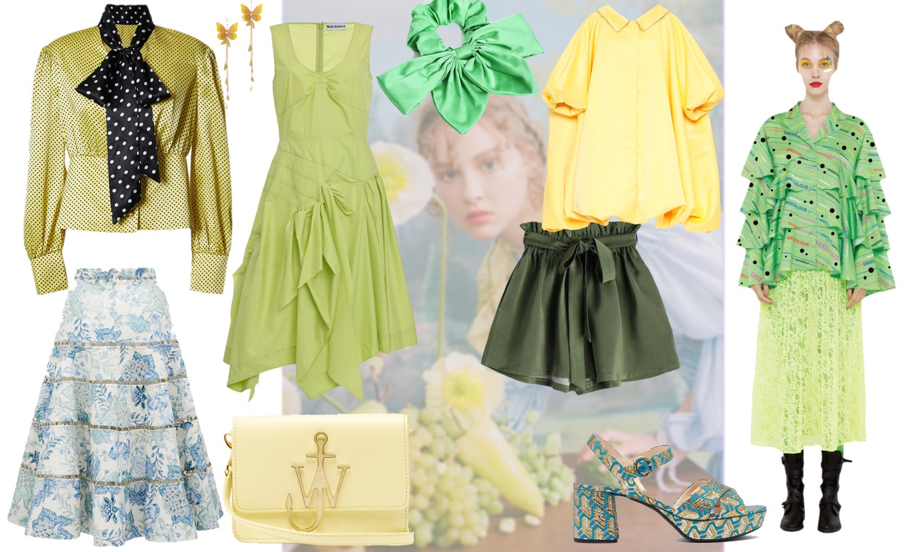 生机与希望的货品基调:提到希望,脑海里大概能浮现出绿色,因为它与自然界中生命的颜色最接近,绿色的树木、绿色的小草,都是生命力的象征。春天迸发出的新绿,是生命在萌芽,希望在生长,因此绿色是最接近希望的颜色。黄色作为太阳的颜色其效果是明朗、乐观的,黄色能带给人们温暖与活力的感觉。如图8-24所示,绿色与黄色搭配,不同明度与纯度的黄绿交相呼应,营造出生机勃勃的氛围。