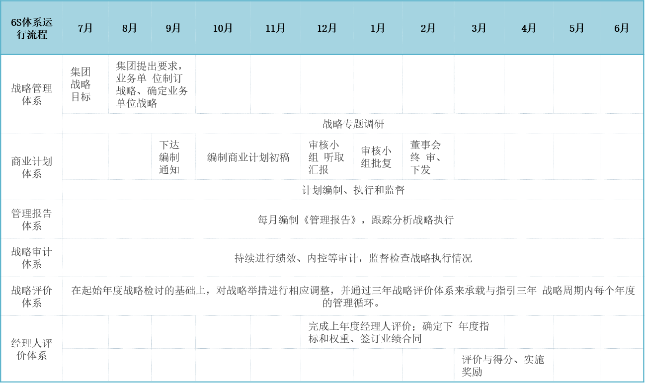 完善的战略管理流程都有一个共同特征:管理日历化(犹如机器一般,对每个战略管理节点都有明确的规定),以华润6S战略管理体系为例,其运行基本流程大体如表15-4所示。