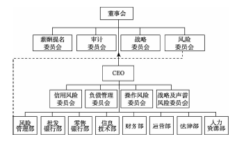 目前,建设银行全行已基本形成了由董事会(风险管理委员会)、行长、风险管理与内控委员会、首席风险官(风险总监、风险主管),以及其他相关部门各负其责、分工合作的风险管理组织架构。下面就信用风险和操作风险做说明。