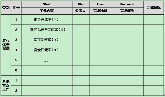关键点二:内容的精细化设计。要求各部门的经营分析材料必须包含三个部分:本季度整体运营完成情况回顾、本季度各项运营指标及重点工作分析、下季度运营计划。各部分内容也要进一步提出精细化的要求,比如,第一部分可以用表6-1固化内容,甚至在表格中把年度经营计划的要求预先填写在表格中,避免有些部门报喜不报忧、经营计划与运营计划两层皮。