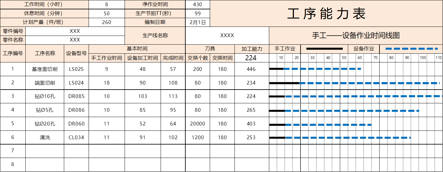 工序能力表示在各工序加工零件时,各工序及整个生产线的生产能力。加工能力计算公式: